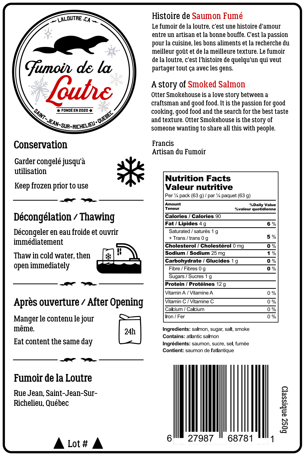Du saumon de l'atlantique fumé à froid avec quatre essences de bois. Il est délicatement salé. Après la fumée, il est maturé pendant plusieurs heures pour développer le goût et la texture.